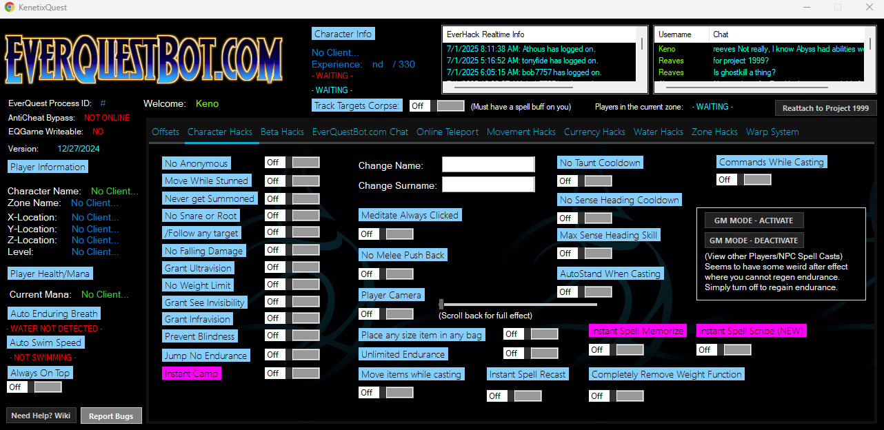 KenetixQuest is the ultimate hacking client for the Project 1999 emulated Server! KenetixQuest will allow you to do things that the EverQuest client would prevent you from doing. Such as instantly warping to any given location in the game, and even giving your character special abilities that would require items, or a spell to achieve!